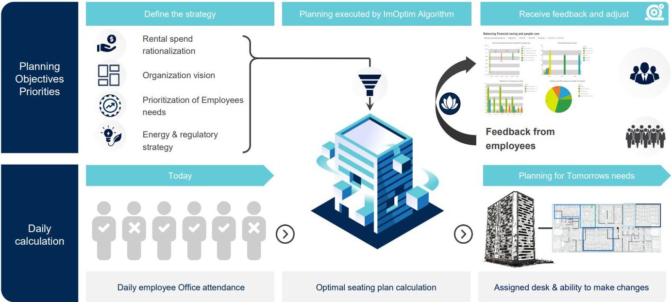 ImOptim calculates the ideal seating arrangement daily to cater to employees' technical needs in order of company-defined priorities, ensuring optimal work conditions.